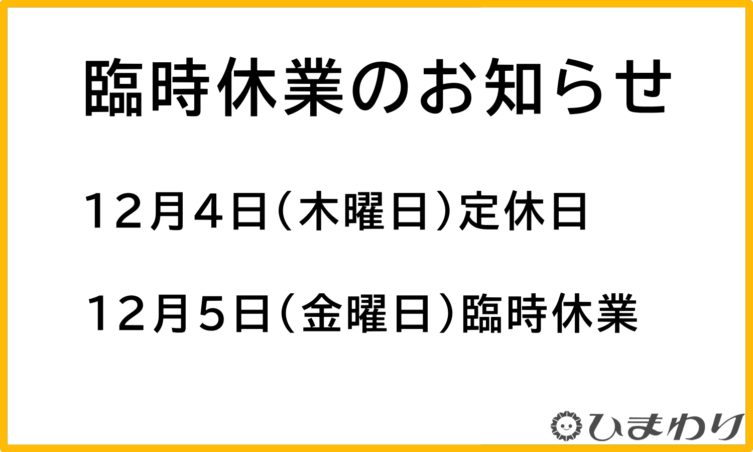 2025年12月4日(木曜日・定休日)5日(金曜日・臨時休業)連休となります。